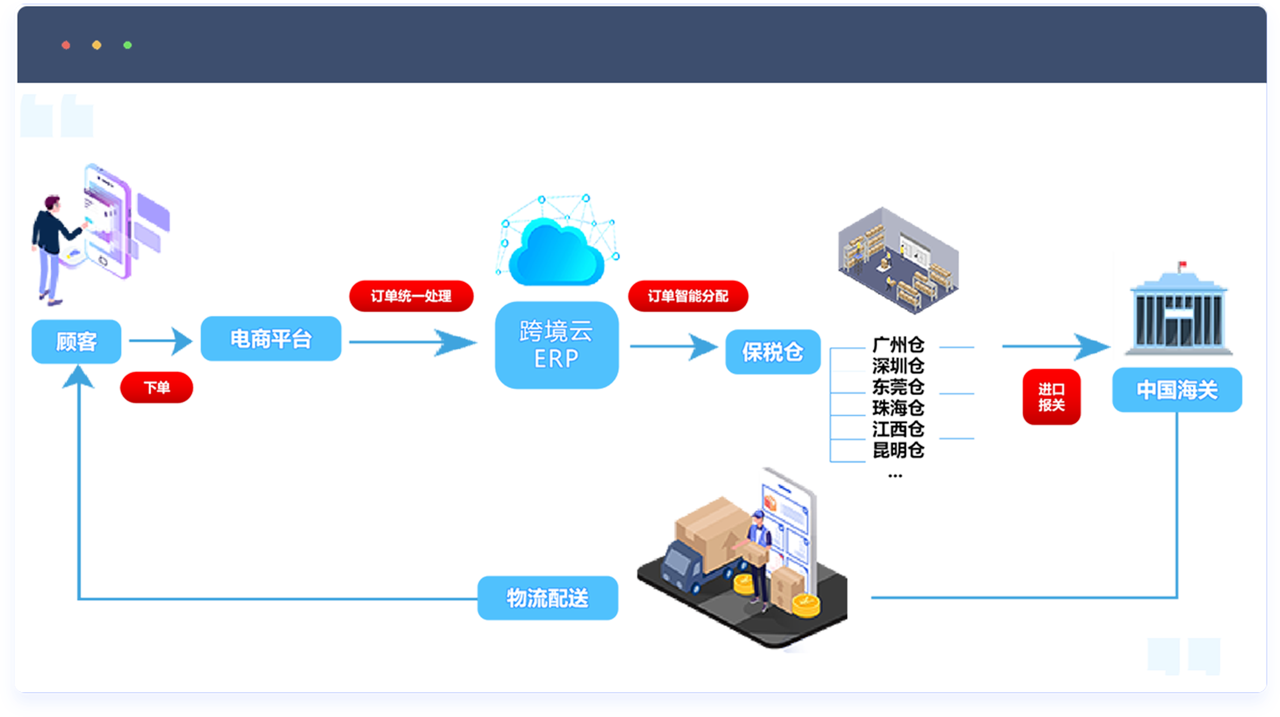 跨境云可为保税仓企业提供定制化保税仓系统,同时可为跨境商家提供关务、物流、保税仓对接、直邮对接等一站式综合解决方案